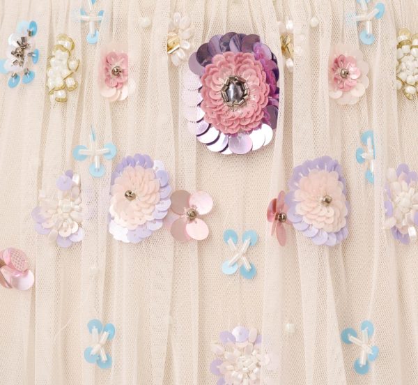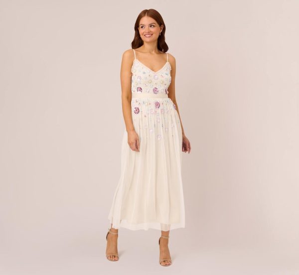 When it comes to sweet details, this beaded gown is dripping in them. This formal dress features a fitted bodice with spaghetti straps, a v-neckline and v-back, and an ankle-length soft skirt. Fully-lined, this ankle-length dress has a mesh overlay adorned with 3D beaded florals and a mix of metallic sequin and beaded details from the bodice just past the waist seam. A zipper closure completes this sleeveless gown. Styled with metallic heels and a beaded clutch, this dress is oh-so romantic.
