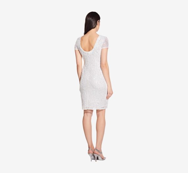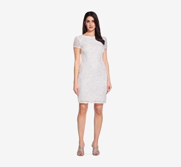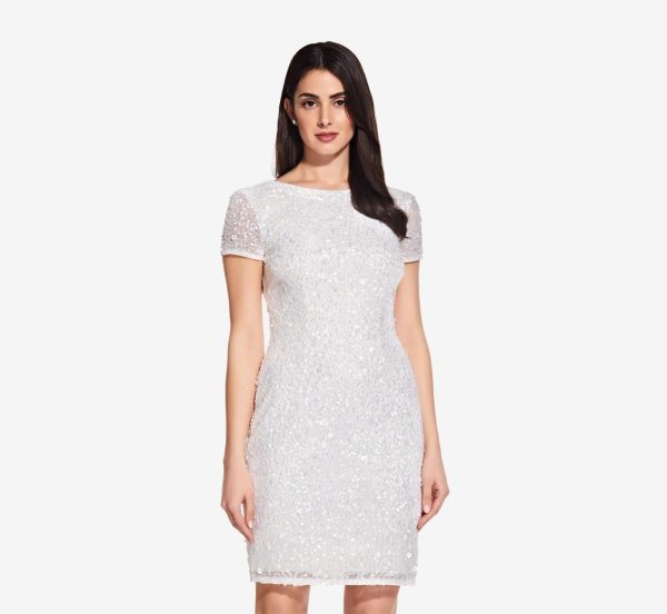 Shine all night when you choose this sparkling sequin cocktail dress for your next celebration. This stunning sequin dress features short sleeves, a sleek, figure-skimming sheath silhouette to help you wow the crowd. A scoop back and back zipper closure round out the features on this fabulous beaded party dress. Create a chic look when you pair this cool cocktail dress with strappy heels and the perfect, little clutch.