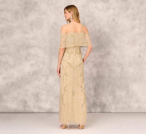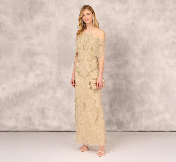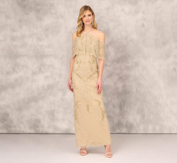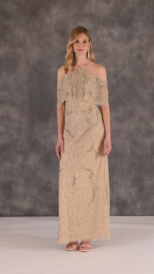 Don’t just shine on your next evening out – bring the drama with this elegant evening gown. This beaded dress features a column silhouette, halter neckline, and a fluttering popover detail at the bodice that shows off the shoulders and contrasts the fitted design. Fully lined, this eveninggown has a sweet mesh overlay that is adorned with a delightful mix of sequins and beading in an art nouveau design that accentuates the figure. A zipper back closure finishes this flutter sleeve dress. Matching neutral high heels and a beaded clutch are the perfect additions to thiscold shoulder dress.