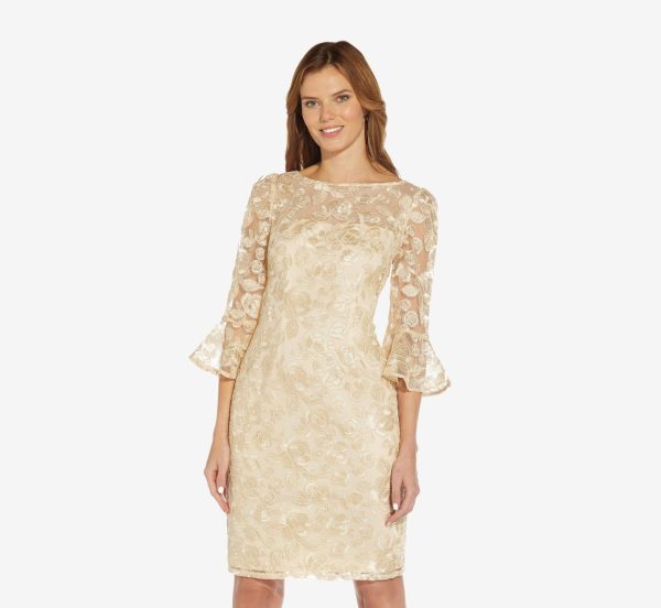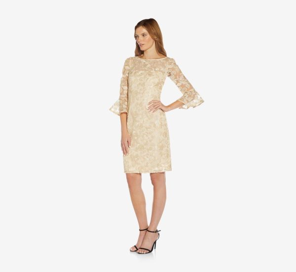 An iconic sheath silhouette with a timeless, feminine twist: an allover floral embroidered design that feels fresh and modern. We love the sheer illusion bateau neckline with mesh lining for comfort and elbow-length bell sleeves.