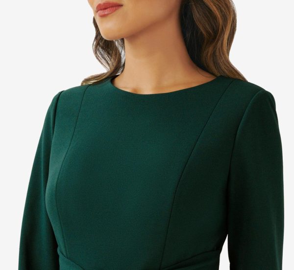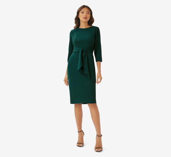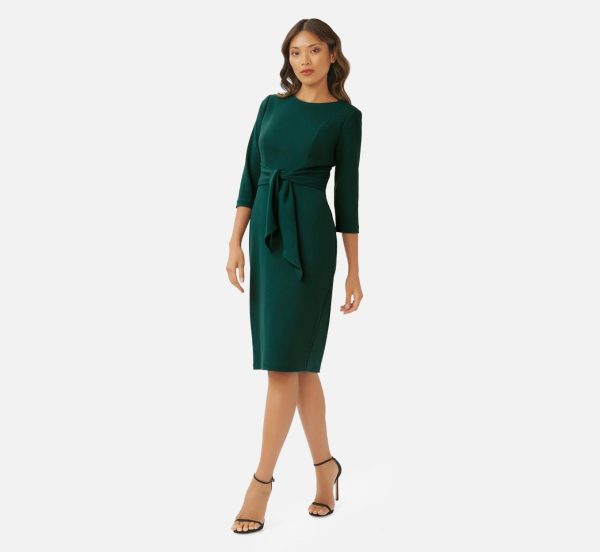 Modern yet sophisticated, this dress will make your day. This day dress features a boat neckline, three quarter sleeves, and a fitted sheath skirt. A self-tie bow at the waist accentuates the figure. Perfect from the office to bridal showers to brunch, this sweet midi dress is the picture of elegance for any event. Crafted from crepe fabric, this dress is partially lined and offers a zipper closure at the back. Add a clutch and stud earrings to complete this effortless dress.