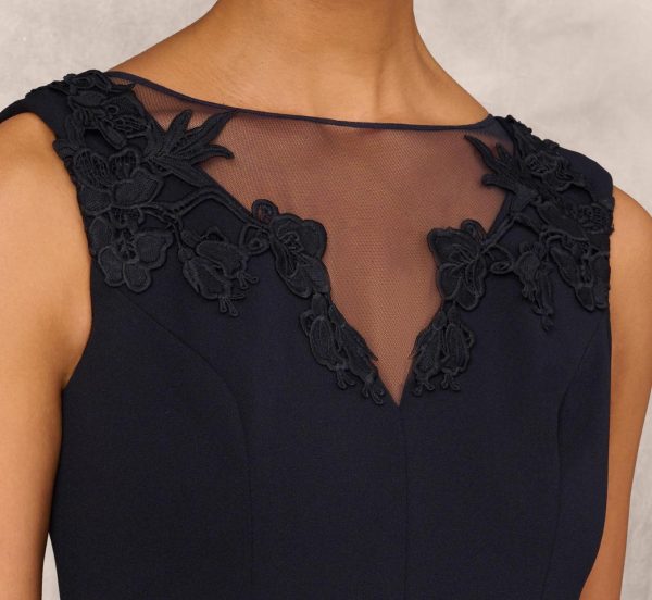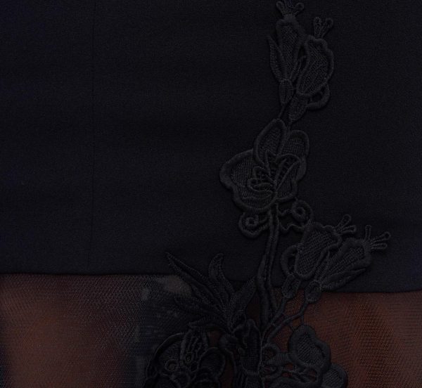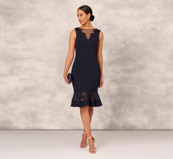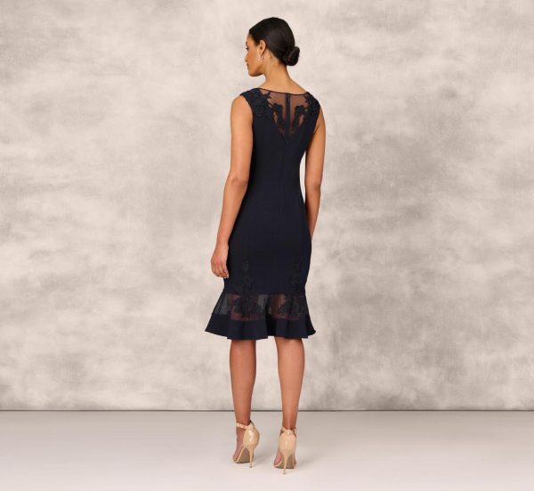 Celebrate your next event in style when you choose this chic sheath cocktail dress. Sheer illusion panels adorn the neck and hemline, while subtle floral embroidery draws the eye. Other details include a back zipper closure. This form-fitting dress, perfect for both daytime and nighttime, will highlight your curves and your impeccable sense of style at once. Rock it with a sleek clutch for your next night out.