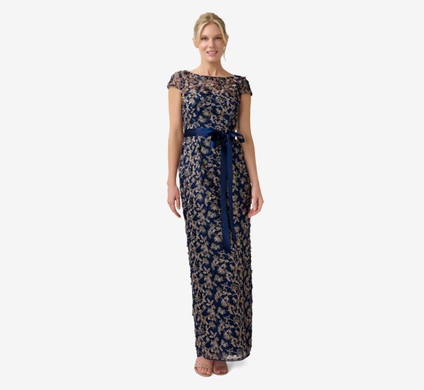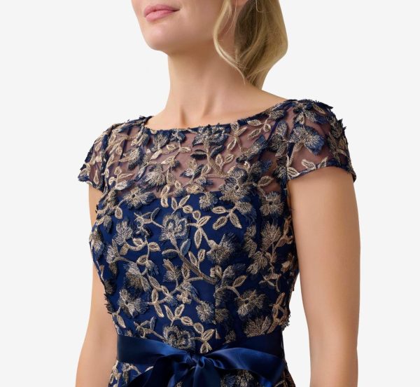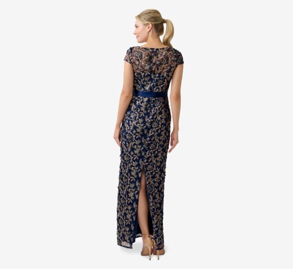 An opulent metallic floral embroidered pattern blooms all over the mesh fabric of our striking column gown. Finished with a satin ribbon tie belt to accentuate your waist. We love the delicate sheer illusion yoke and cap sleeves. Back zip closure. Calling all wedding guests and black-tie gala attendees, we love this for you.