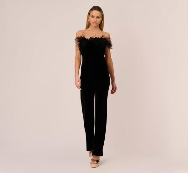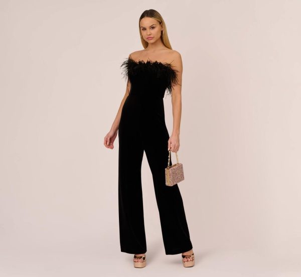 When you need a look that smolders, our iconic jumpsuit in a sumptuous stretch velvet is your ticket. We’re obsessed with the dramatic (and flirty) feather trim. Features built-in boning that enforces the fitted silhouette. All the details: a shoulder-baring strapless bodice and wide-leg pants. Sleek back zip closure.