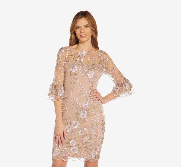 This feminine floral dress features a boat neckline, three-quarter bell sleeves, a curve-skimming sheath skirt with a scalloped hem, and a back zipper closure. Beautiful floral embroidery throughout means this special occasion dress stands apart from the crowd. Make any event all the more fabulous when you wear this sheath dress to your next bridal shower, baby shower, or Sunday brunch. Add in sparkling stud earrings, a chic handbag, and the perfect pair of polished pumps to create a look that’s guaranteed to shine. Embroidery and ornamentation on this dress was constructed by hand. Due to this, slight variations or irregularities may be occur.