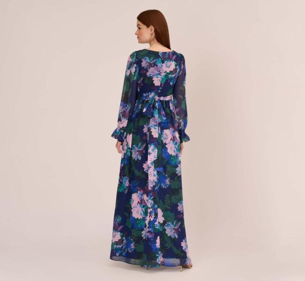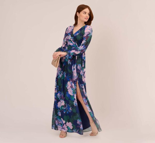 Lightweight and lighthearted, our long gown in a flowy and soft chiffon fabric features an eye-catching floral print. Designed with a wrap bodice with pleated detail that tops a long, shirred skirt with front slit for added drama. Sheer long sleeves with elastic flare cuffs. Finished with a self-tie belt to accentuate your waist.