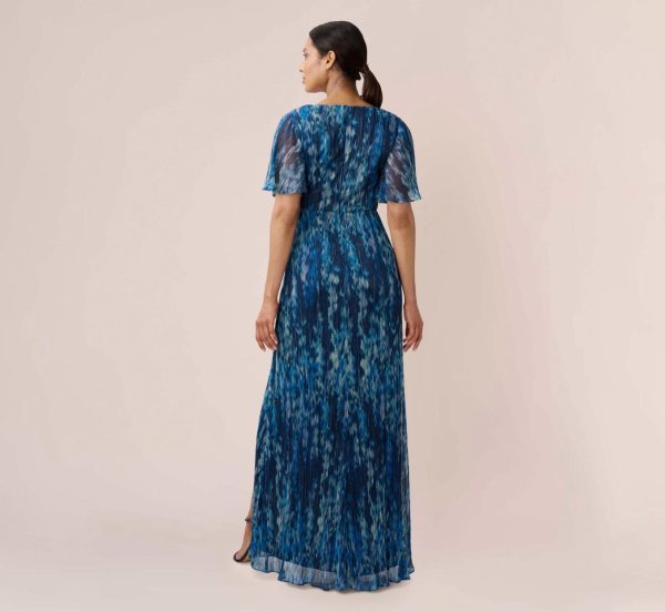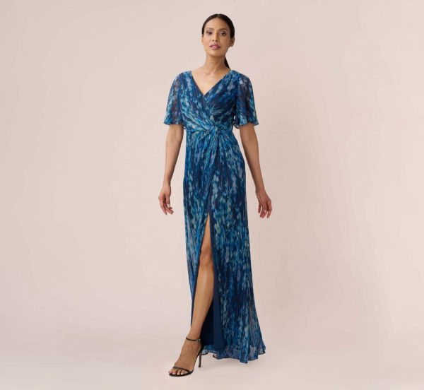 Lightweight and airy, our faux wrap long gown features an eye-catching watercolor floral print on an easy-fitting metallic mesh. We love the figure-flattering faux wrap bodice with pleated detail and the softly draped modified mermaid skirt with front slit opening. All the details: chic sheer flutter sleeves and back zip closure.