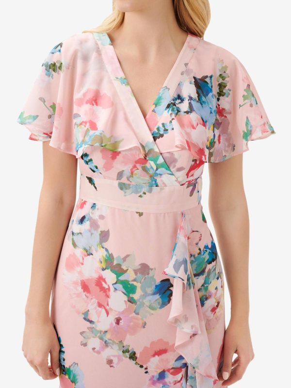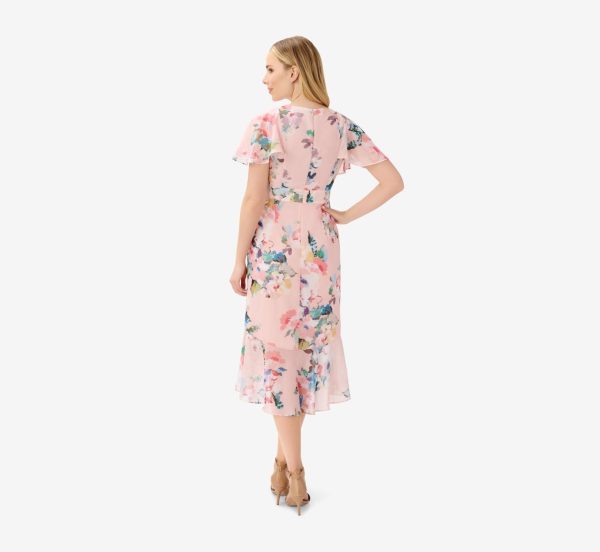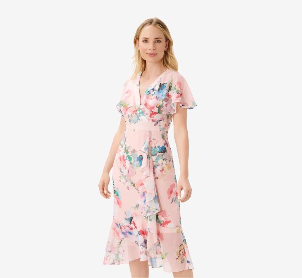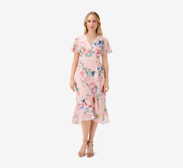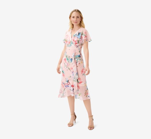 Lightweight and lighthearted, soft florals bloom allover our chic faux wrap dress in a lightweight chiffon and stretch woven twill fabric. Beautifully shaped with a surplice neckline and sheer flutter sleeves. A banded waist tops the flirty skirt with cascading ruffle detail. Back hook-and-eye/zip closure. The perfect dress for brunch, baby/bridal showers and wedding receptions.