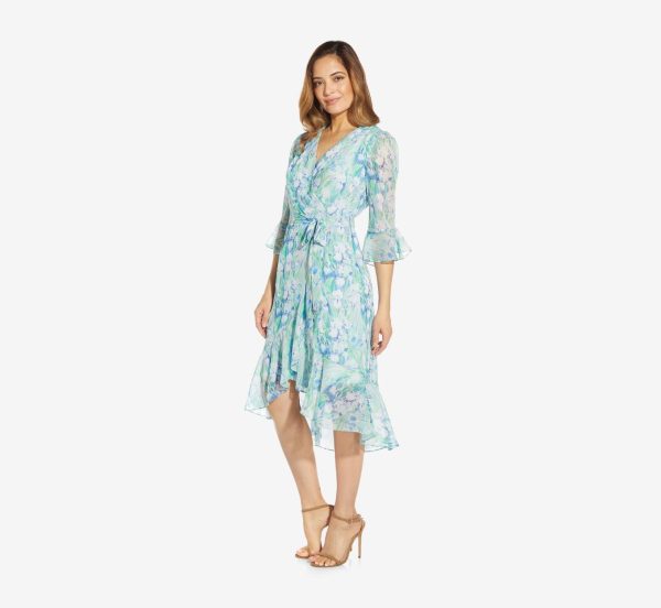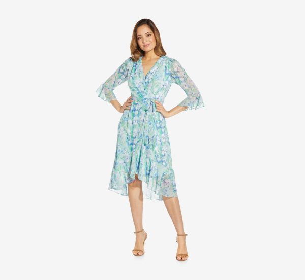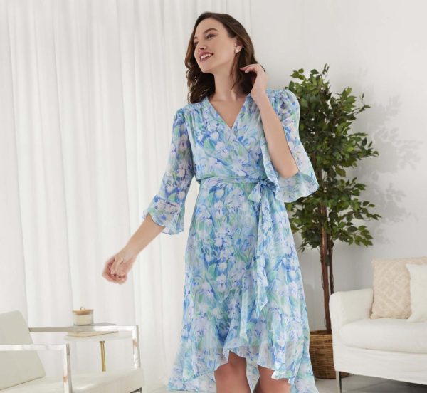 Lightweight, airy and floats like a dream, our softly woven chiffon faux wrap dress is designed in a seriously romantic floral print. We love the surplice v-neckline, three-quarter bell sleeves, self-tie belt and ruffled high/low hem. Perfect for bridal showers, brunch dates, wedding receptions and packs easily to take on vacation.