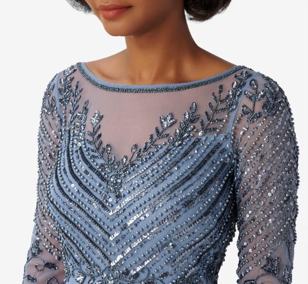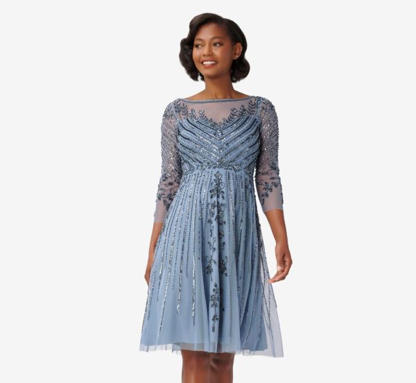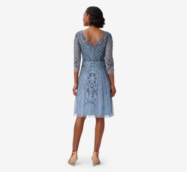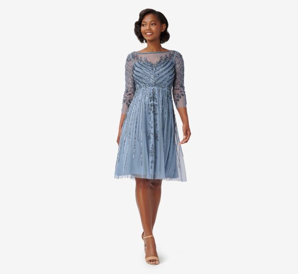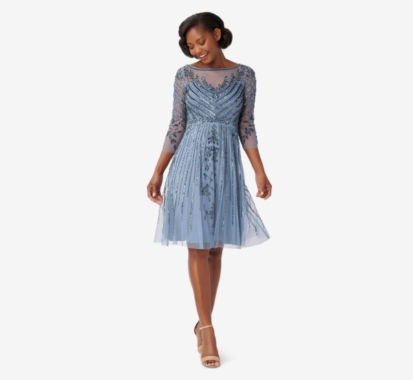 An instant crowd pleaser, our fit-and-flare cocktail dress is hand-embellished allover with sparkling beads in an intricate pattern. Most-loved details: sheer illusion yoke and three-quarter sleeves with flared cuffs. The seamed waist tops the soft midi skirt with gentle pleats for added fullness. Finished with sleek back zip closure.