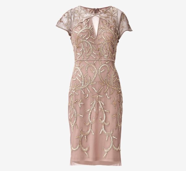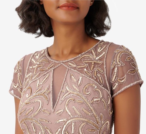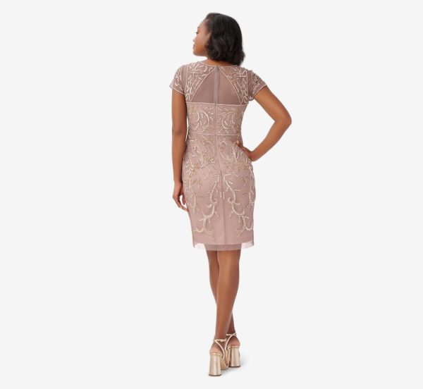 Short, sweet and unique, exquisitely patterned handsewn beadwork dances allover a layer of luxe mesh. We’re obsessed with the illusion cutout crew neckline and short sleeves. This sparkling cocktail dress ensures you’ll turn heads at cocktail parties, wedding receptions and any night that calls for a toast.