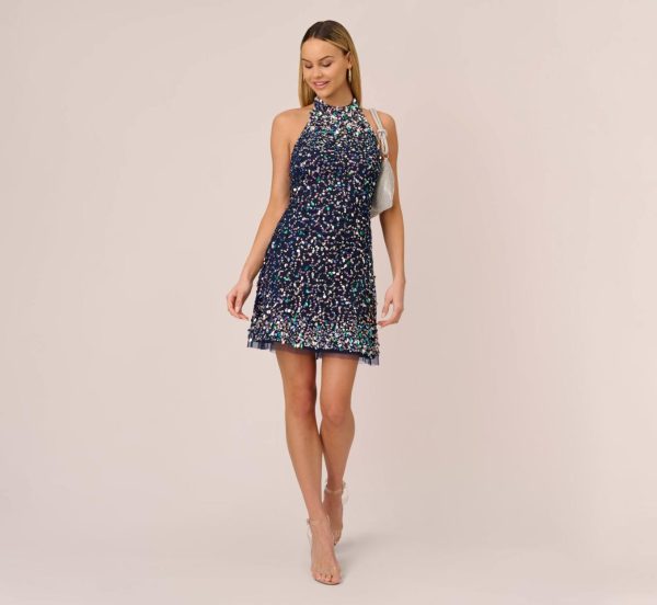 Sparkle at every turn in our mini party dress with stunning allover handsewn beading. The fit-and-flare silhouette streamlines your figure and is eased with a flared hemline. We love the shoulder-revealing halter neckline with mock collar. Make a striking entrance at your next cocktail party, wedding reception and easily packs for vacation.