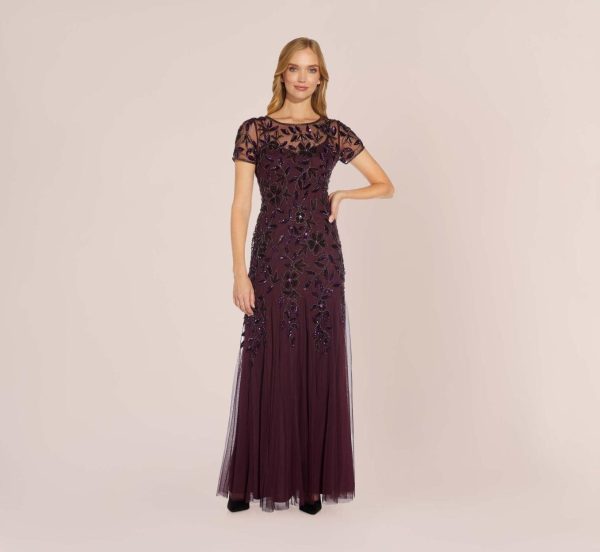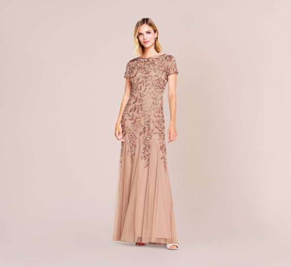 Hand Beaded Short Sleeve Floral Godet Gown In Marble Marble | Women Adrianna Papell Floral Dresses