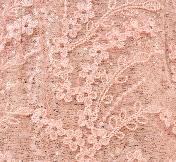 This striking column gown blends a touch of elegance with an air of romance. The feminine floral embroidered overlay is dotted with handsewn sequins for a touch of sparkle. All the details: sheer illusion yoke and elbow sleeves with bell cuffs. Sleek back zip closure.