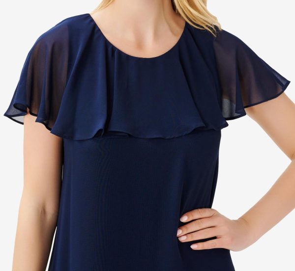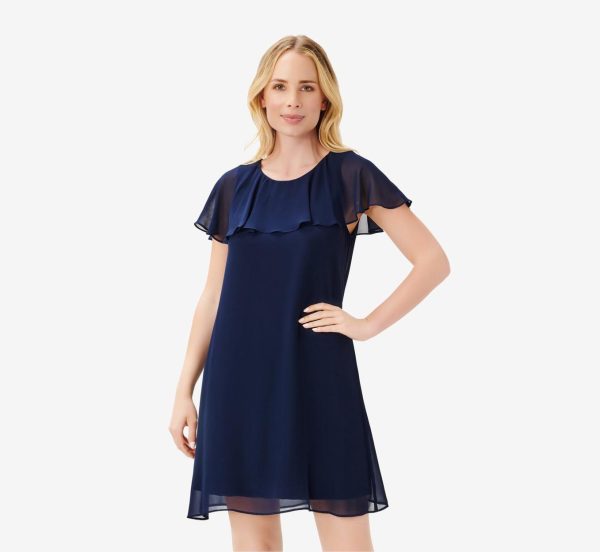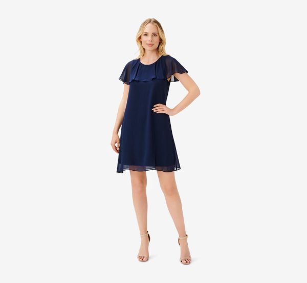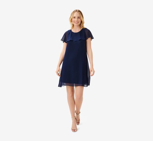 A modern shift dress in a sleek stretch jersey fabric with lightweight and airy chiffon overlay. We’ve designed this shift dress with clean lines that streamline your figure and a floaty ruffled capelet. Back hook-and-eye/zip closure. Versatile and unique, this dress is perfect for so many occasions.