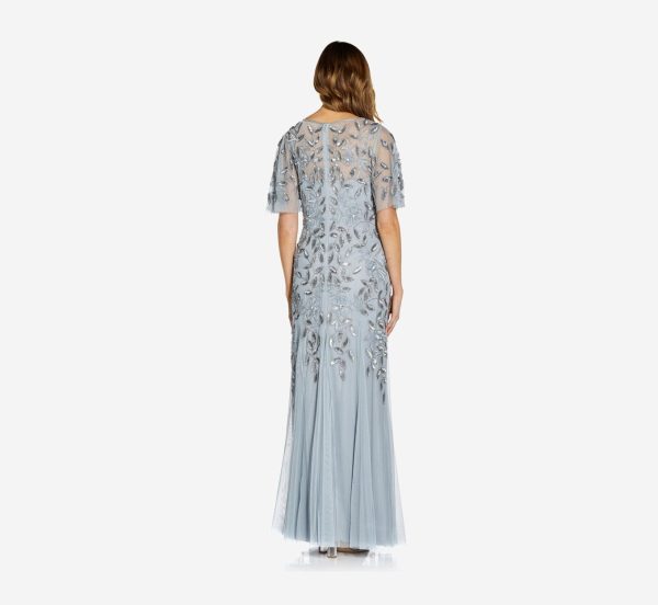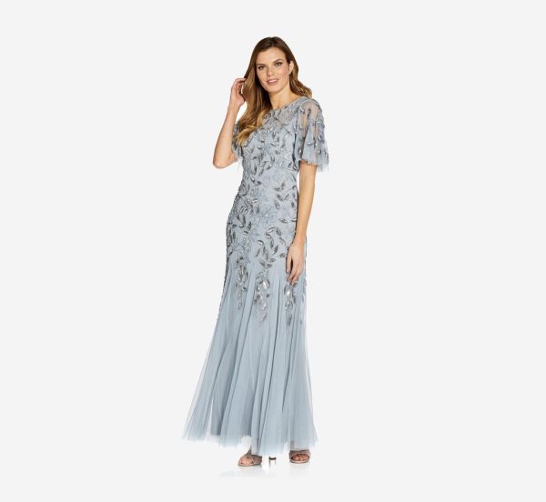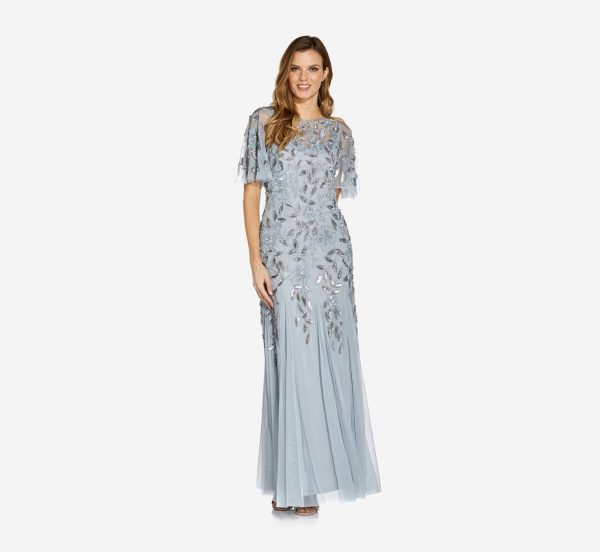 A work of art: our long dress features exquisite hand beadwork in a delicate floral pattern. Designed in a streamlined silhouette that is eased with elbow-length flutter sleeves and soft mermaid skirt with godets that create right amount of movement. All the details: flattering no waist seam and sheer illusion yoke and sleeves. Sleek back zip closure. Calling all mothers-of-the-bride and groom, we love this for you.