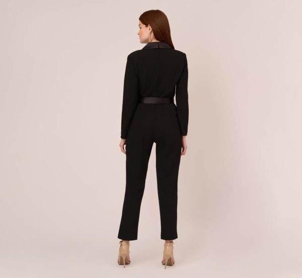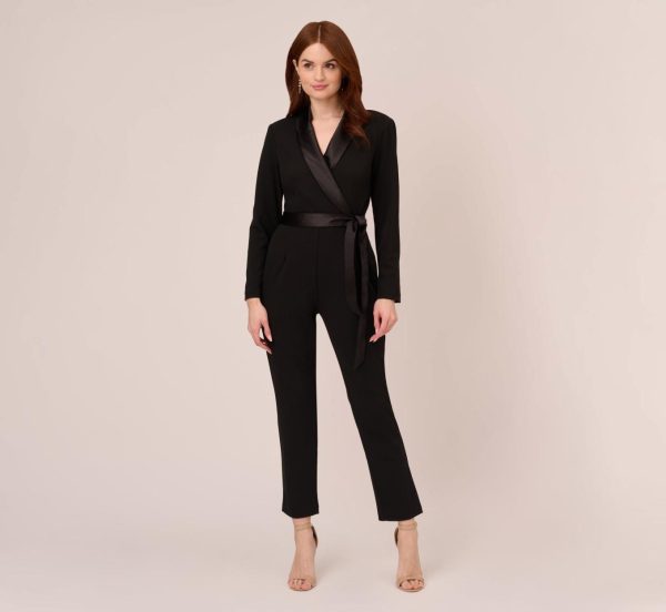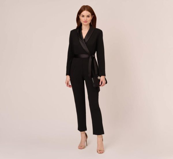 A savvy alternative to the sheath, this tailored jumpsuit will take you effortlessly from day to night. Created in our stretch crepe fabrication this sophisticated all-in-one is cleverly enhanced by a tuxedo-inspired satin collar. While feminine elements, including a tapered leg, faux wrap bodice, and removable waist-cinching sash, ensure a flattering fit. Complement this smart jumpsuit with towering heels and a striking clutch.
