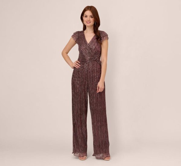 Shine meets style in this short sleeve jumpsuit. This dressy jumpsuit features a surplice bodice with ruffled short sleeves and a v-neckline, a knotted accent at the waist, and wide-leg pants. Crafted from a crinkle-knit, metallic fabric, this semi-formal jumpsuit has a subtle sparkle when it catches the light. A zipper closure at the back completes this design. Styled with metallic heels and a beaded clutch, this jumpsuit is ready for any cocktail party or black-tie wedding.