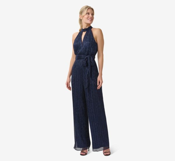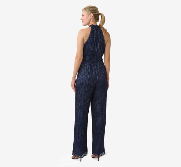 Get ready to take the spotlight in our best-selling jumpsuit, fashioned from a lightweight and easy-fitting metallic crinkled mesh fabric. We’ve updated our iconic style to feature a shoulder-baring halter neckline with a mock collar and a front keyhole opening. Details: a flattering blouson bodice, detachable self-tie belt closure and wide-leg pants. Sleek back zip closure.