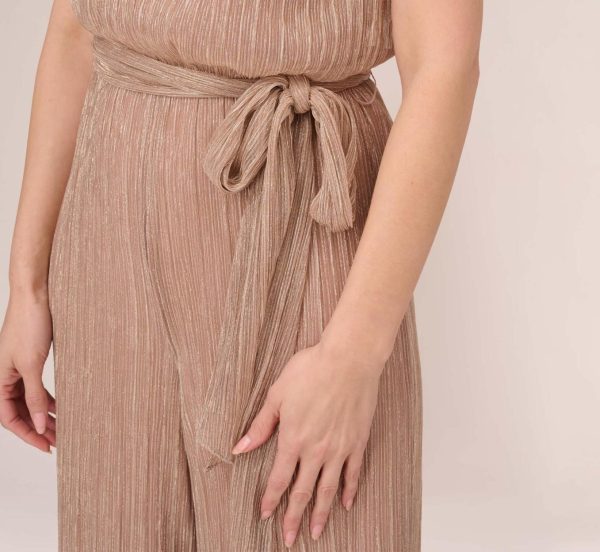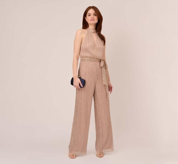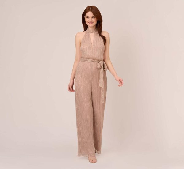 Metallic Crinkled Mesh Halter Jumpsuit With Keyhole In Taupe Pink Taupe/Pink | Women Adrianna Papell Jumpsuits