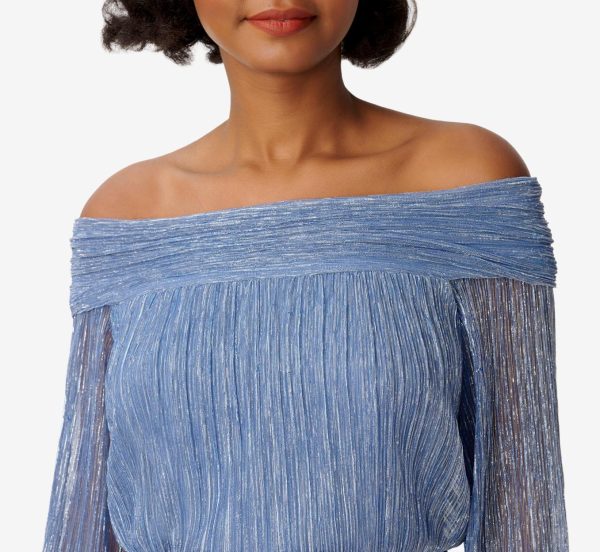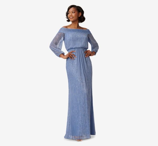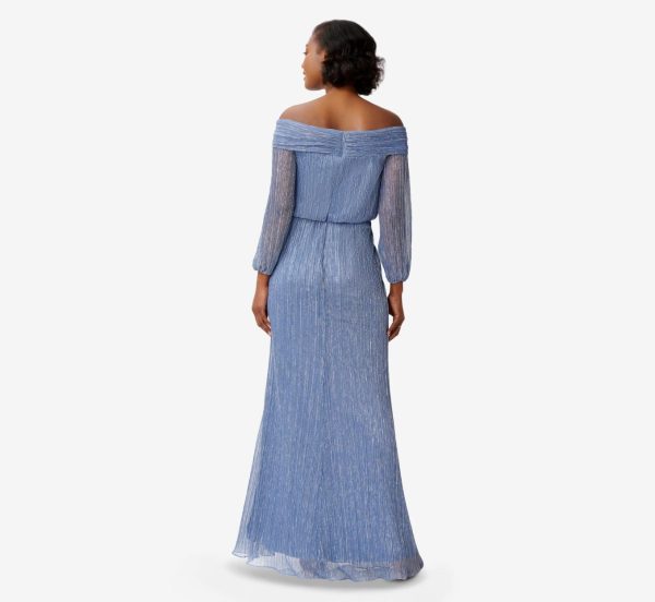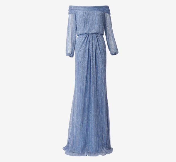Make your evening more magical in our floor-sweeping gown in a sparkly crinkled metallic mesh. Shaped with a shirred off-the-shoulder neckline and our iconic and super-flattering blouson silhouette that is cinched at the waist and then gracefully billows over it. Finished with sheer long bishop sleeves and a soft skirt with gently pleating. Back hook-and-eye/zip closure. A perfect choice for mothers-of-the-bride or groom, wedding guests and black-tie gala attendees.