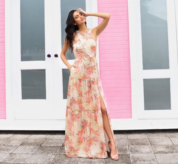 A bevy of abstract florals and a sultry silhouette define this maxi dress with hints of clip dotted metallic threading for added shine. Designed with a chic halter neckline and crisscross bodice with ruching atop the tiered maxi skirt with a thigh-high slit that will make every step you take even more dramatic. Sleek back zip closure.