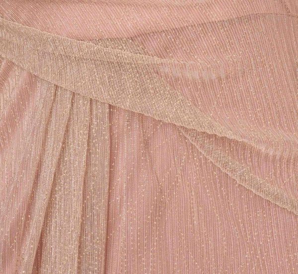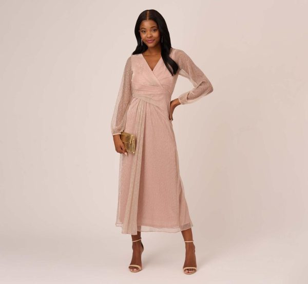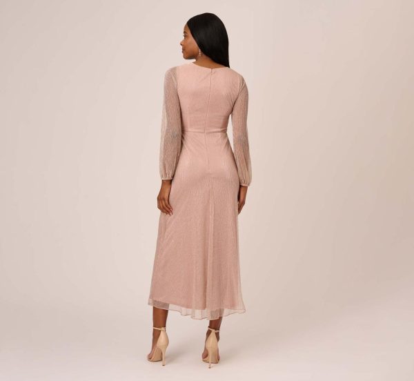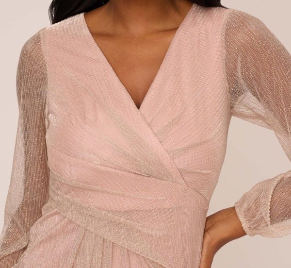 A figure-flattering fit yet light and airy feel gives this ankle-length dress the right balance. Crafted with a shimmering metallic crinkled mesh fabric, this easy-fitting style features a surplice neckline and sheer bishop long sleeves for added allure. Long skirt with pleated detailing creates movement and sway. Sleek back zipper and hook and eye closure. A glamorous choice for your next night out.