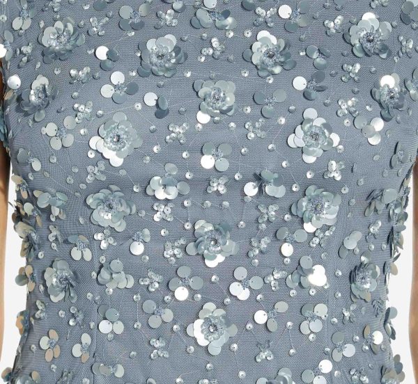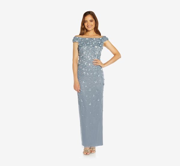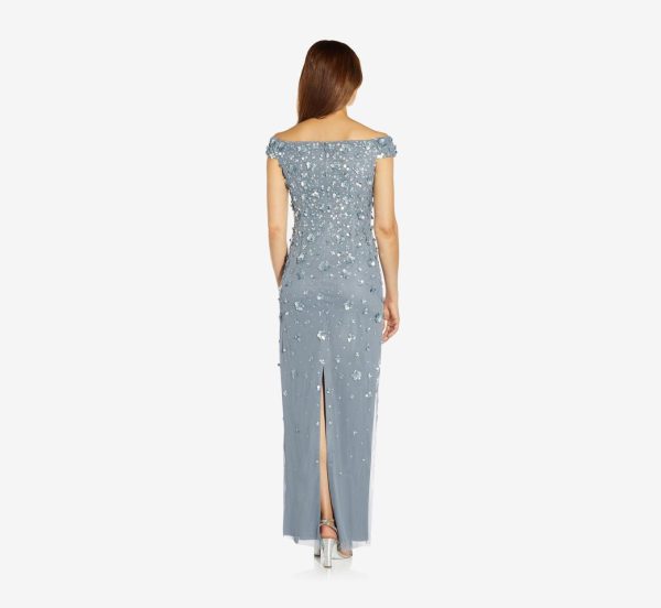 Feminine and fabulous, this special occasion dress features a romantic off-shoulder neckline, a floral embellished bodice, and a long, straight skirt with a back slit, and back zipper closure. Take on your next formal in style with this stunning evening dress. Whether for a wedding, gala or other black-tie event, you can’t go wrong with a party dress this polished. Wear this formal dress with sparkling chandelier earrings, a chic, metallic clutch, and a sexy pair of strappy heels for a glamorous look that is sure to shine. Beading and embellishments on this garment were sewn by hand, making each dress beautifully unique. Slight variations or irregularities may be present.