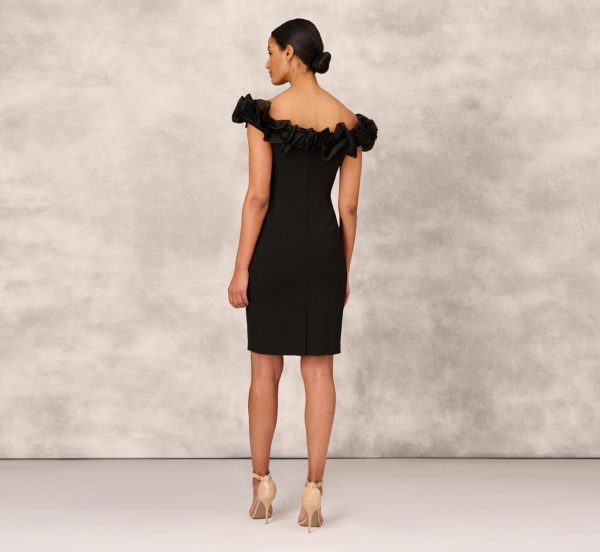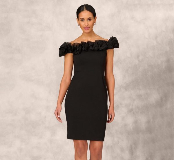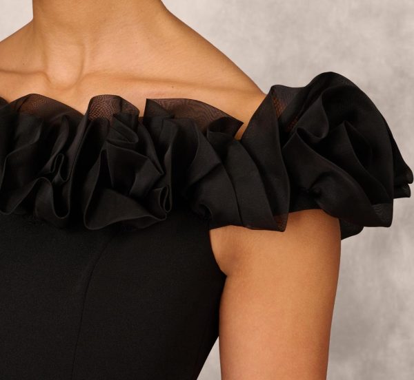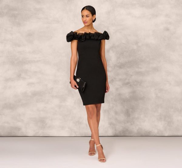 This off the shoulder dress features a fitted silhouette crafted from crepe fabric and floral organza trim at the neckline. A hidden zipper closes this Aidan Mattox cocktail dress at the back.