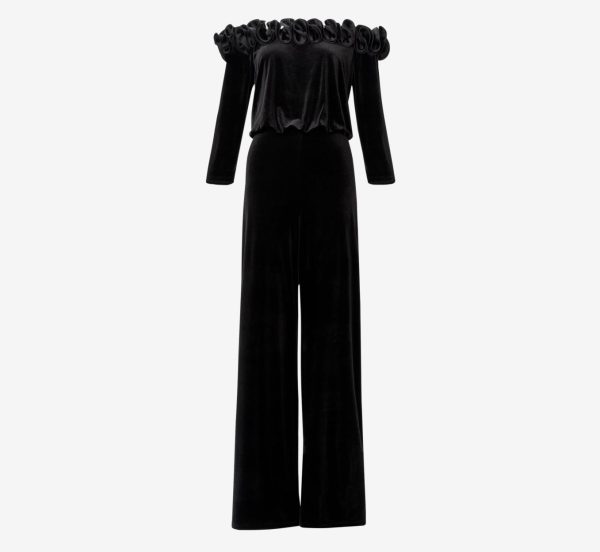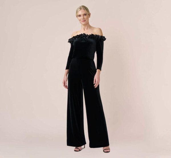 Off-The-Shoulder Velvet Blouson Jumpsuit With Satin Rosettes In Black Black | Women Adrianna Papell Jumpsuits