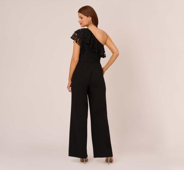 One Shoulder Crepe Jumpsuit With Lace Ruffle Details In Black Black | Women Adrianna Papell Jumpsuits