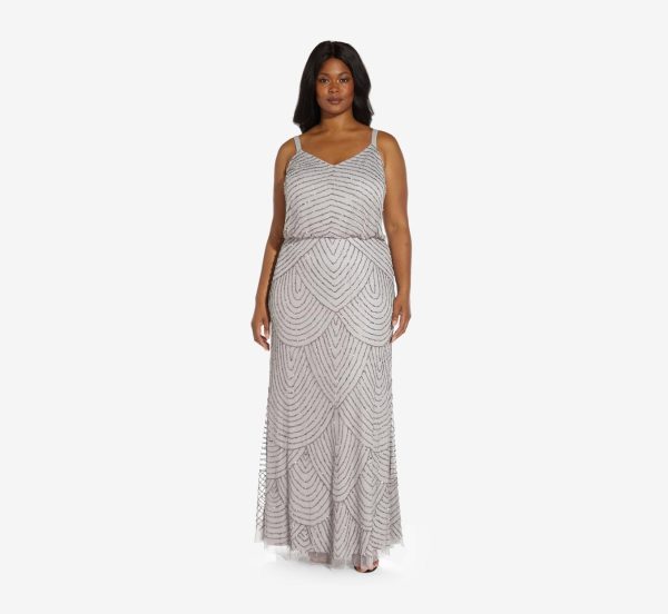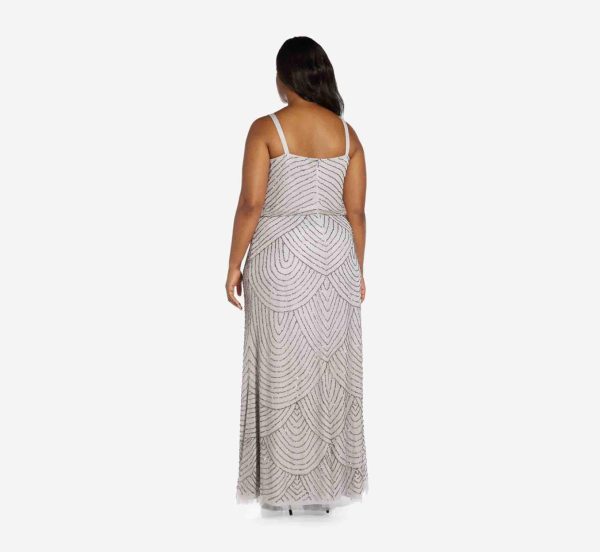 A scalloped pattern of sparkling beads cascade down this beautiful gown, featuring a flattering blouson silhouette.