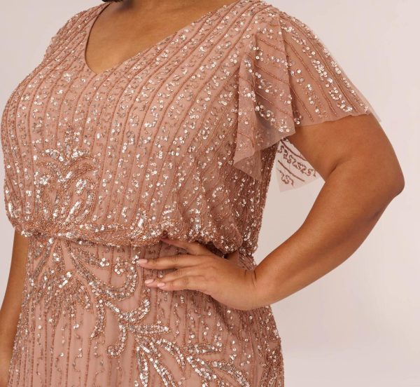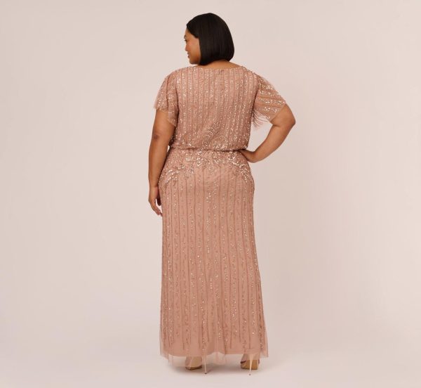 Plus Size Fleur Beaded Blouson Gown With Sheer Short Sleeves In Rose Gold Rose Gold | Women Adrianna Papell Long Dresses