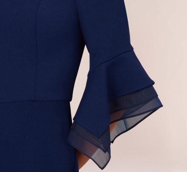 Statement-making sleeves are just one reason to love this off the shoulder jumpsuit. Featuring wide leg pants, this jumpsuit has 3/4 length sleeves accented by asymmetrical organza details. Designed with stretch knit crepe, this off the shoulder jumpsuit is an ultra comfortable look. Azipper back and hook and eye closure complete this jumpsuit. Style this dramatic jumpsuit with a statement making heel to finish the style.