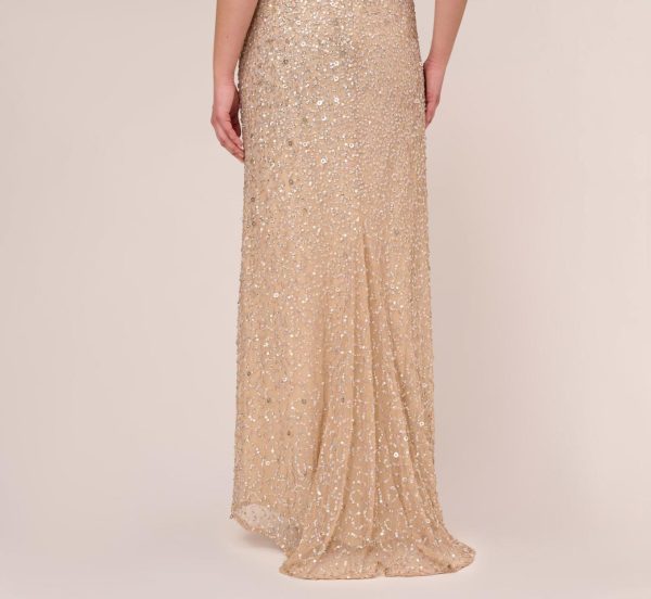 A dramatic and eye-catching scoop back gown is covered in glittering sequins, finished with a sheer partial train.This Adrianna Papell design has been made from the finest and most luxurious fabrics. All bead work, embroidery and ornamentation has been done completely by hand. Slight irregularities or variations should not be regarded as defective or damaged, rather a testament to the garment’s unique beauty.