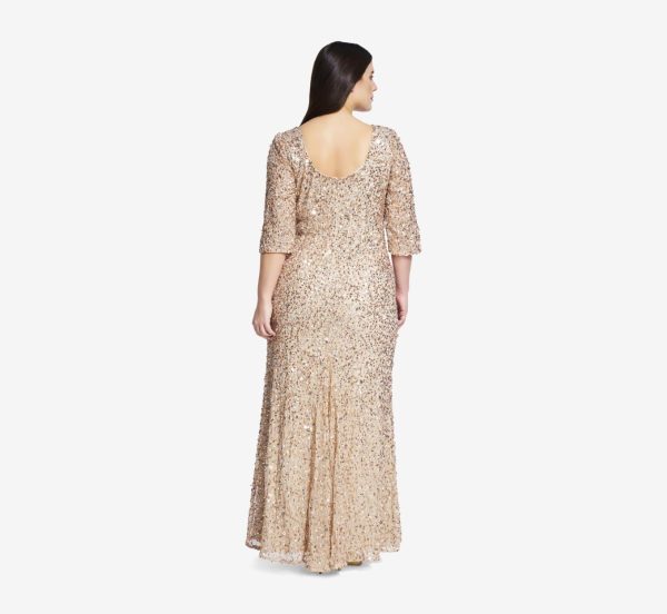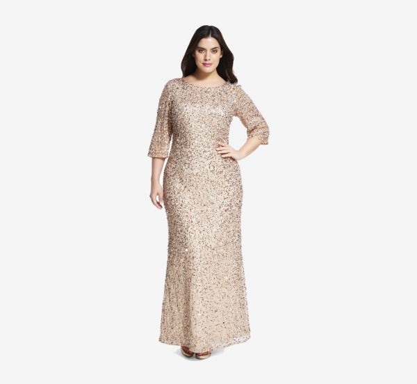 Rows upon rows of glittering sequins adorn this beautiful three-quarter sleeve gown, cast in an elegant silhouette.This Adrianna Papell design has been made from the finest and most luxurious fabrics. All bead work, embroidery and ornamentation has been done completely by hand. Slight irregularities or variations should not be regarded as defective or damaged, rather a testament to the garment’s unique beauty.