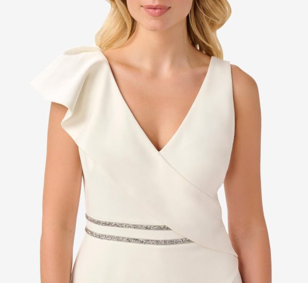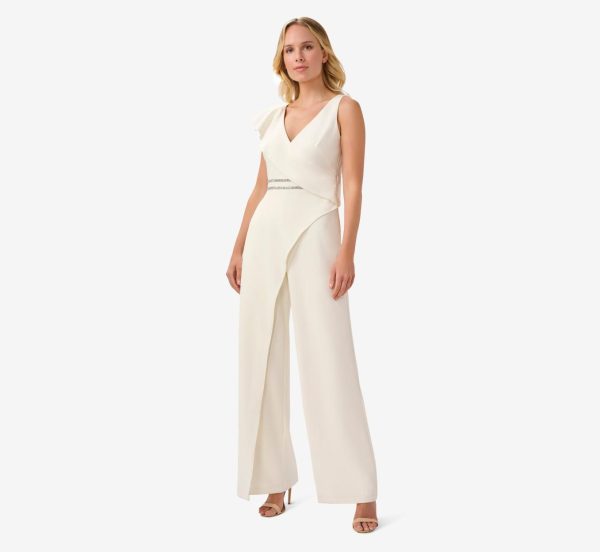 All eyes in the room will be on you in this striking look. This season’s favorite style, the jumpsuit, is crafted of a lightweight satin crepe with a touch of stretch for a smooth, comfortable fit. This sleek style is designed with a flattering surplice neckline and striking ruffled accent along one shoulder. We’re obsessed with the shimmering crystal trim at the waist. Wide-leg silhouette. Love for every minute of wedding seasonbridal showers to rehearsal dinnerand a perfect choice for a wedding reception.