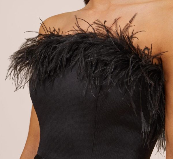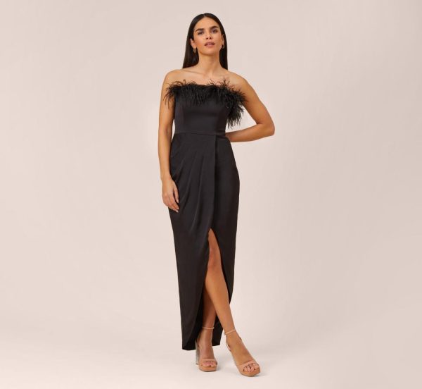 Turn heads at your next special occasion in our strapless column dress, crafted from a textured woven stretch satin with ethically sourced ostrich feather trim framing the neckline. Designed with a draped wrap skirt to create modern allure. Back zipper with hook and eye closure. Chic and unique, we love this dress for prom, black-tie galas and any of your upcoming special occasions. Poly stretch lining.