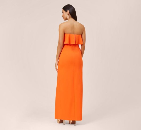 Crafted from a luxurious stretch woven crepe, this strapless style features a deep slit for a flirty leg reveal. Sleek back zipper with hook and eye closure. The popover detail on this striking dress creates an artfully draped layer that adds architectural interest at prom, wedding celebrations and all your special occasions. Poly stretch lining.