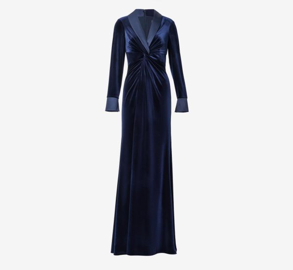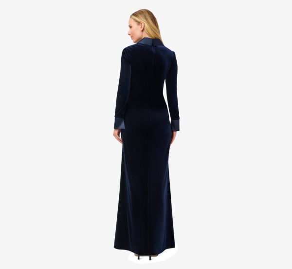A polished look that gets its inspiration from a menswear-inspired style. Our floor-sweeping gown in a soft stretch velvet knit fabric features a satiny charmeuse shawl collar and a flattering twist-front design for textural interest. All the details: modern long sleeves with charmeuse cuffs, flattering surplice neckline and sleek back zip closure. Get ready to be best dressed guest at wedding receptions and black-tie galas.